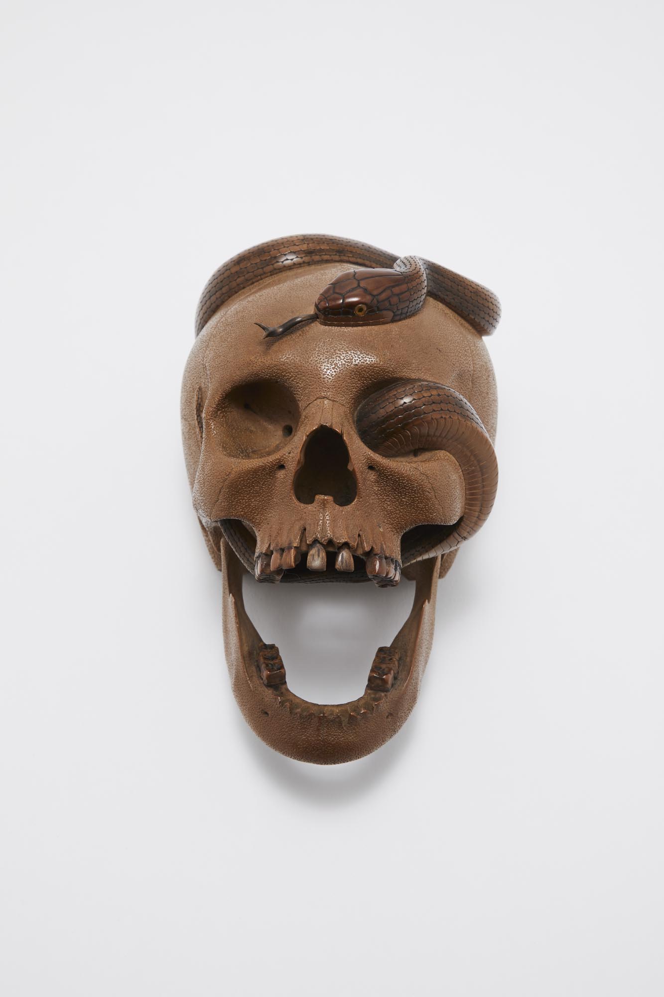 𝐀𝐦𝐨𝐧𝐠 𝐭𝐡𝐞𝐬𝐞 𝐩𝐢𝐞𝐜𝐞𝐬, 𝐚𝐧 𝐞𝐱𝐜𝐞𝐩𝐭𝐢𝐨𝐧𝐚𝐥 𝐉𝐚𝐩𝐚𝐧𝐞𝐬𝐞 𝐕𝐚𝐧𝐢𝐭𝐚𝐬, 𝐚 𝐰𝐨𝐨𝐝𝐞𝐧 𝐨𝐤𝐢𝐦𝐨𝐧𝐨 𝐛𝐲 𝐈𝐳𝐮𝐦𝐢 𝐒𝐮𝐤𝐞𝐲𝐮𝐤𝐢 (𝟏𝟖𝟑𝟖-𝟏𝟗𝟐𝟎) 𝐰𝐡𝐢𝐜𝐡 𝐝𝐞𝐩𝐢𝐜𝐭𝐬 𝐚 𝐬𝐧𝐚𝐤𝐞 𝐰𝐢𝐧𝐝𝐢𝐧𝐠 𝐢𝐭𝐬 𝐰𝐚𝐲 𝐭𝐡𝐫𝐨𝐮𝐠𝐡 𝐚 𝐬𝐤𝐮𝐥𝐥 𝐰𝐢𝐭𝐡 𝐚𝐧 𝐚𝐫𝐭𝐢𝐜𝐮𝐥𝐚𝐭𝐞𝐝 𝐥𝐨𝐰𝐞𝐫 𝐣𝐚𝐰 𝐚𝐧𝐝 𝐚𝐝𝐝𝐞𝐝 𝐭𝐞𝐞𝐭𝐡. 𝐈𝐭𝐬 𝐞𝐲𝐞𝐬 𝐚𝐫𝐞 𝐢𝐧𝐥𝐚𝐢𝐝 𝐰𝐢𝐭𝐡 𝐩𝐢𝐞𝐜𝐞𝐬 𝐨𝐟 𝐛𝐥𝐨𝐧𝐝 𝐜𝐨𝐥𝐨𝐫𝐞𝐝 𝐡𝐨𝐫𝐧 𝐬𝐞𝐭 𝐨𝐧𝐭𝐨 𝐠𝐨𝐥𝐝 𝐟𝐥𝐚𝐤𝐞𝐬, 𝐚𝐧𝐝 𝐭𝐡𝐞𝐢𝐫 𝐩𝐮𝐩𝐢𝐥𝐬 𝐚𝐫𝐞 𝐫𝐞𝐧𝐝𝐞𝐫𝐞𝐝 𝐰𝐢𝐭𝐡 𝐭𝐰𝐨 𝐬𝐦𝐚𝐥𝐥 𝐩𝐢𝐞𝐜𝐞𝐬 𝐨𝐟 𝐛𝐥𝐚𝐜𝐤 𝐛𝐮𝐟𝐟𝐚𝐥𝐨 𝐡𝐨𝐫𝐧. 𝐓𝐡𝐞 𝐭𝐨𝐧𝐠𝐮𝐞 𝐢𝐬 𝐬𝐢𝐥𝐯𝐞𝐫. 𝐓𝐡𝐞 𝐡𝐞𝐚𝐝 𝐢𝐬 𝐚 𝐧𝐚𝐭𝐮𝐫𝐚𝐥 𝐛𝐥𝐨𝐧𝐝 𝐜𝐨𝐥𝐨𝐫. 𝐁𝐨𝐭𝐡 𝐭𝐡𝐞 𝐫𝐞𝐩𝐭𝐢𝐥𝐞 𝐚𝐧𝐝 𝐢𝐭𝐬 𝐭𝐞𝐞𝐭𝐡 𝐚𝐫𝐞 𝐢𝐧 𝐬𝐡𝐚𝐝𝐞𝐬 𝐨𝐟 𝐨𝐜𝐡𝐫𝐞 𝐚𝐧𝐝 𝐛𝐫𝐨𝐰𝐧.