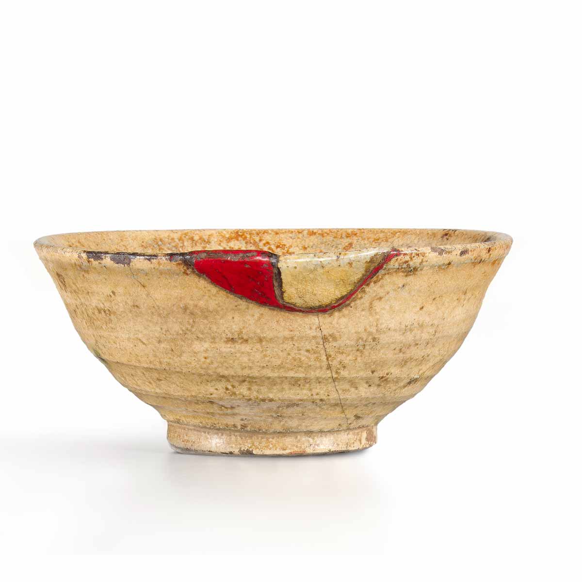 Yellow Seto stoneware tea bowl and red lacquer yobitsugi restoration
