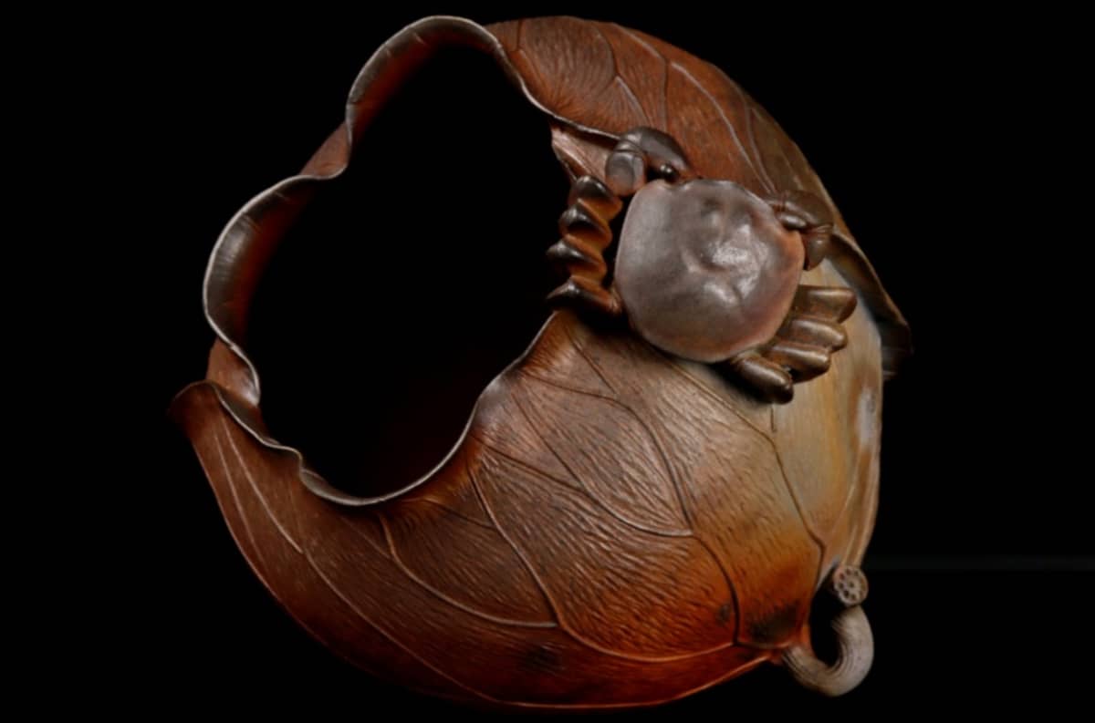 Lotus and Crab bizen vase by Konishi Toko II (Mitsue) (1927-2018)