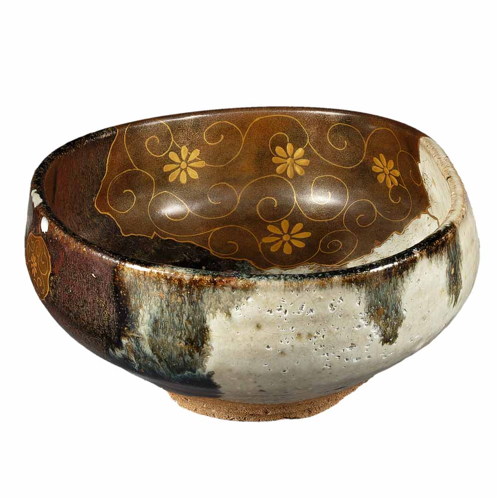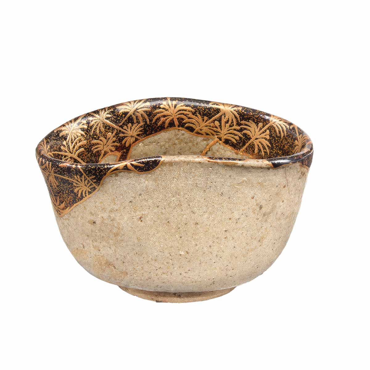 Karatsu sandstone tea bowl and kintsugi restoration with gold lacquer
