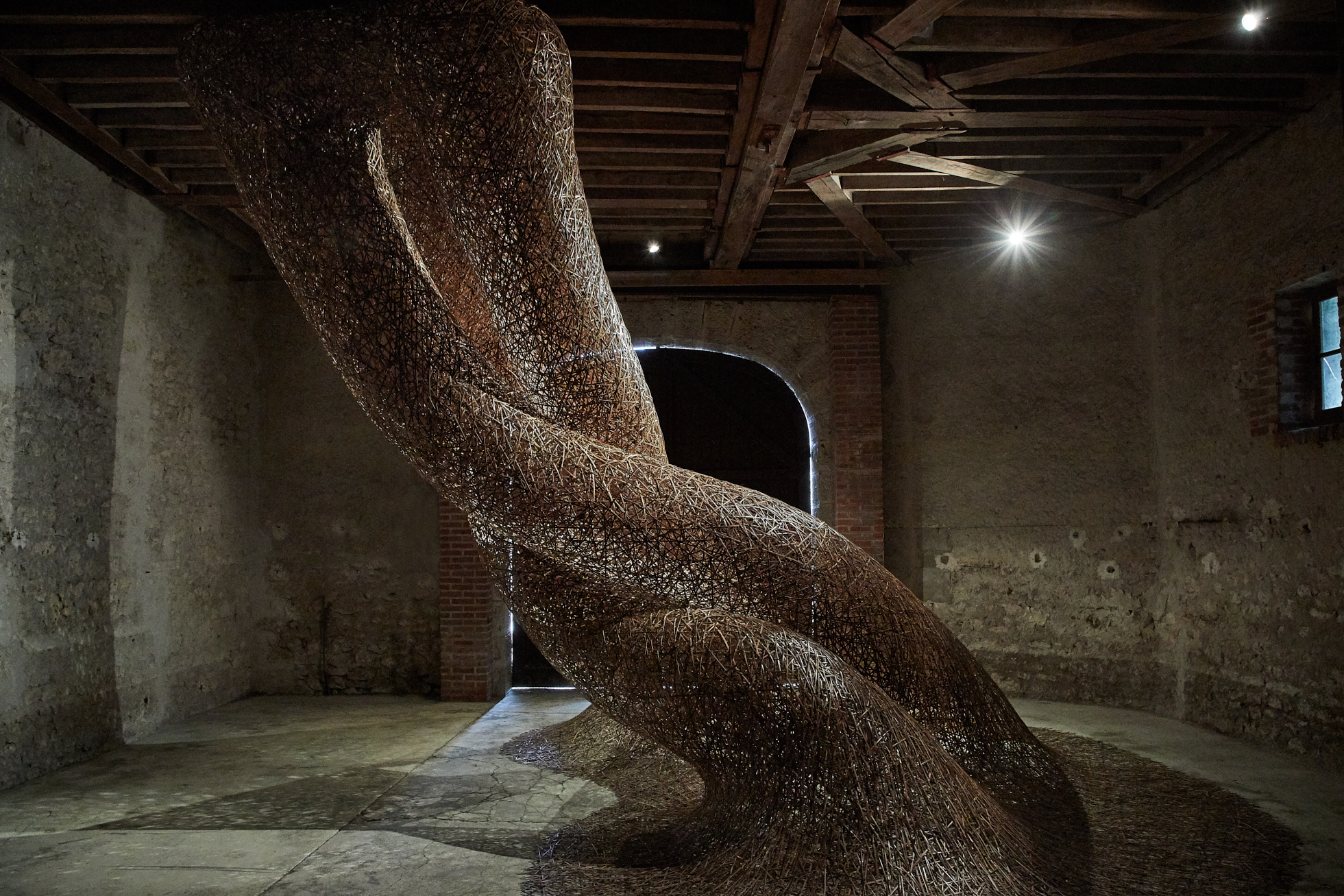 The Sakai-based artist who created this installation, Tanabe Chikuunsai IV, comes from a long line of bamboo craftsmen. Previously known as Tanabe Shōchiku, he took up the family name earlier this year. He earned a degree in sculpture from the Tokyo University of the Arts and trained in bamboo crafts at an occupational school in Beppu. One of the most talented and versatile bamboo artists of his generation, he has carried on the Tanabe family tradition in the wake of the death of his father, Tanabe Chikuunsai III (1940–2014), while also exploring the possibilities of large-scale sculpture and installations made of tiger bamboo, such as this one.