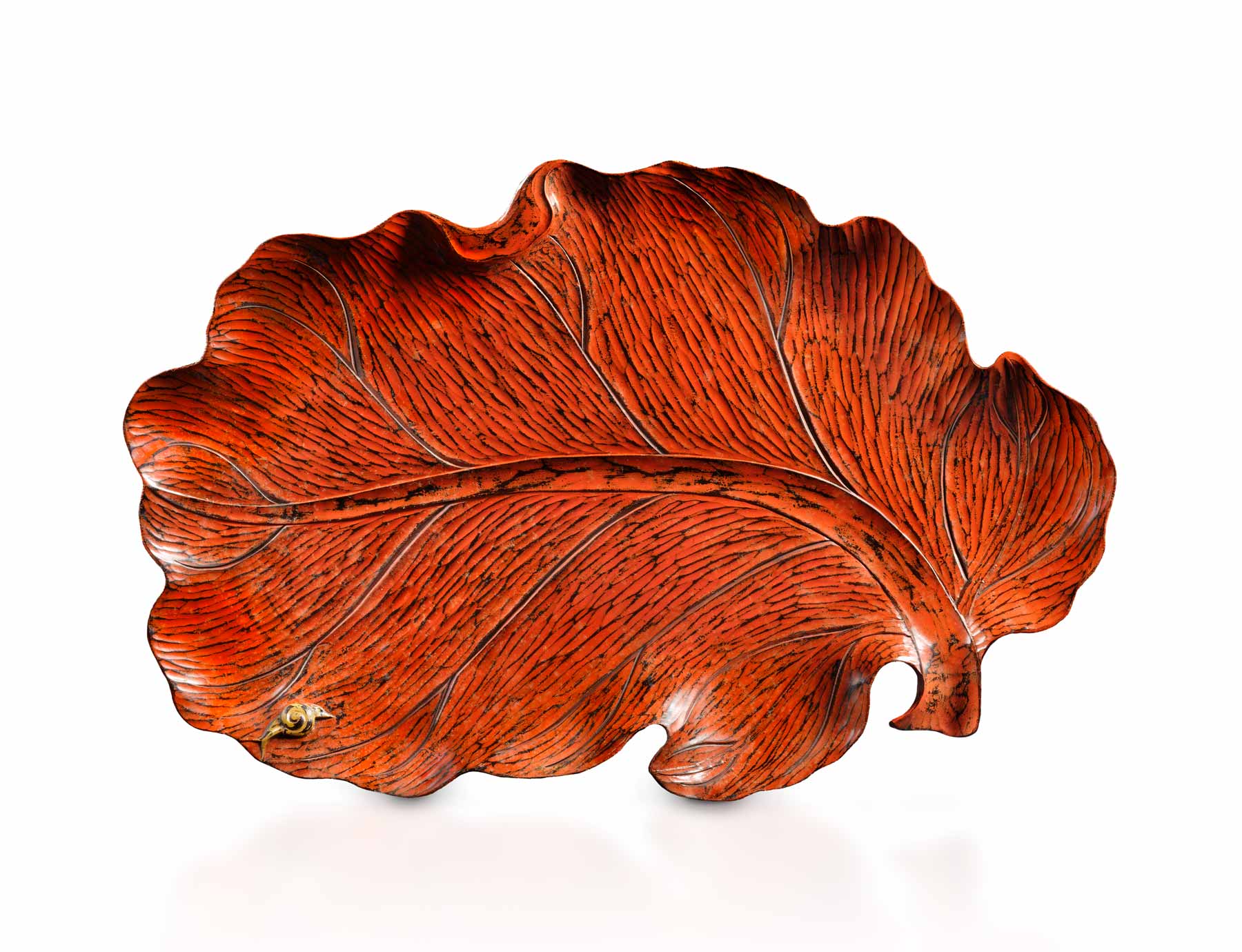 Sanuki lacquer carving, a leaf-shaped tray for arranging seasonal fruits and leaves, made by Seibundo