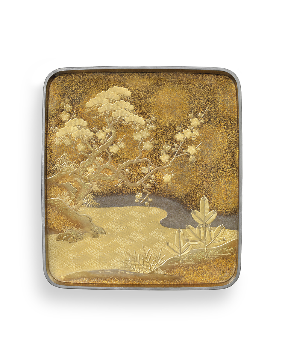 This set in amazing perfect condition is a masterpiece made with several lacquer techniques. Taka-makie which gives a cubic effect. Kirikane expressing moss and the like by placing the golden metal leaves. Kimetsuke which depicts the holes on the ground or the rocks by putting the golden metal fragments.