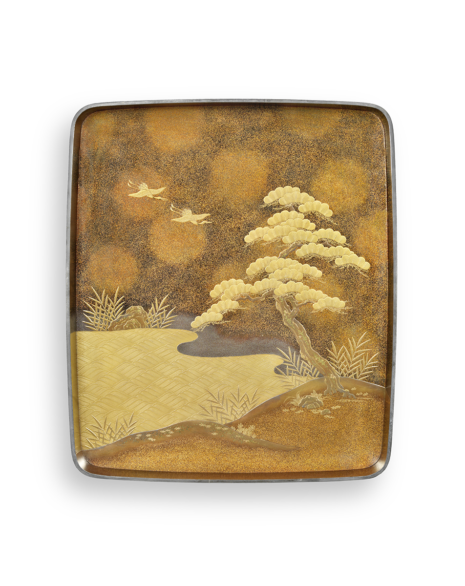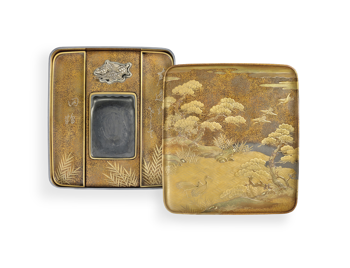 However, the most important technique which completes this piece for a great gorgeous masterpiece is nashiji. It covers all over the piece, even the backside of cover and inside, and the polka-dotted pattern by putting the golden powders with different density has an illusory impression. The water drop is a shape of minogame (tortoise with algaes) which is auspicious for longevity. The hidden letters are separated partially, and the letters on the stationary box and on the ink stone box are different. When they are together, the letters complete the poem. Perfectly calculated pieces to the details they are.