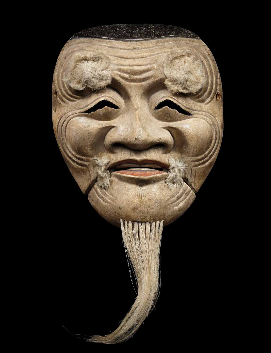 Okina, also known as Hakushikijō, this white-faced mask of a happy old man is used in noh theater and festival performances of the play OKINA, also known as SHIKISANBA.