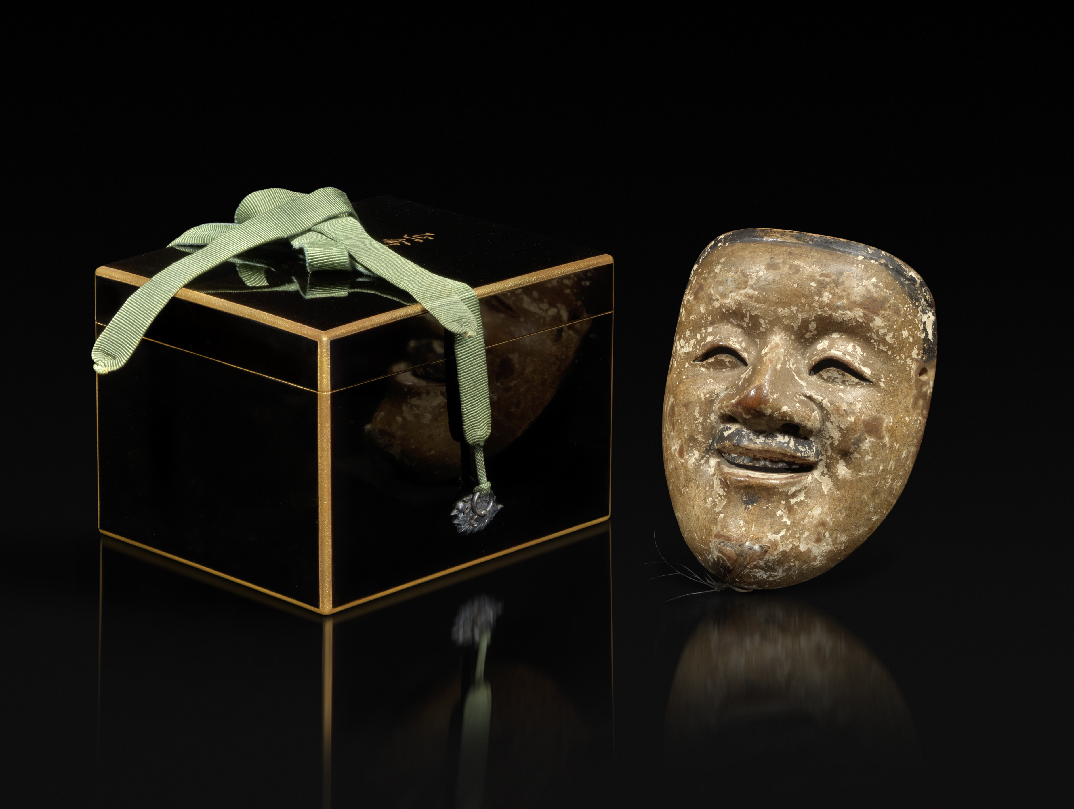 On the wooden box and in the lacquered box for the mask we find some information about it, i.e. its supposed origin, from Kamigamo -one of the most important Shinto temples in Kyoto- and its dating to the Kamakura period.