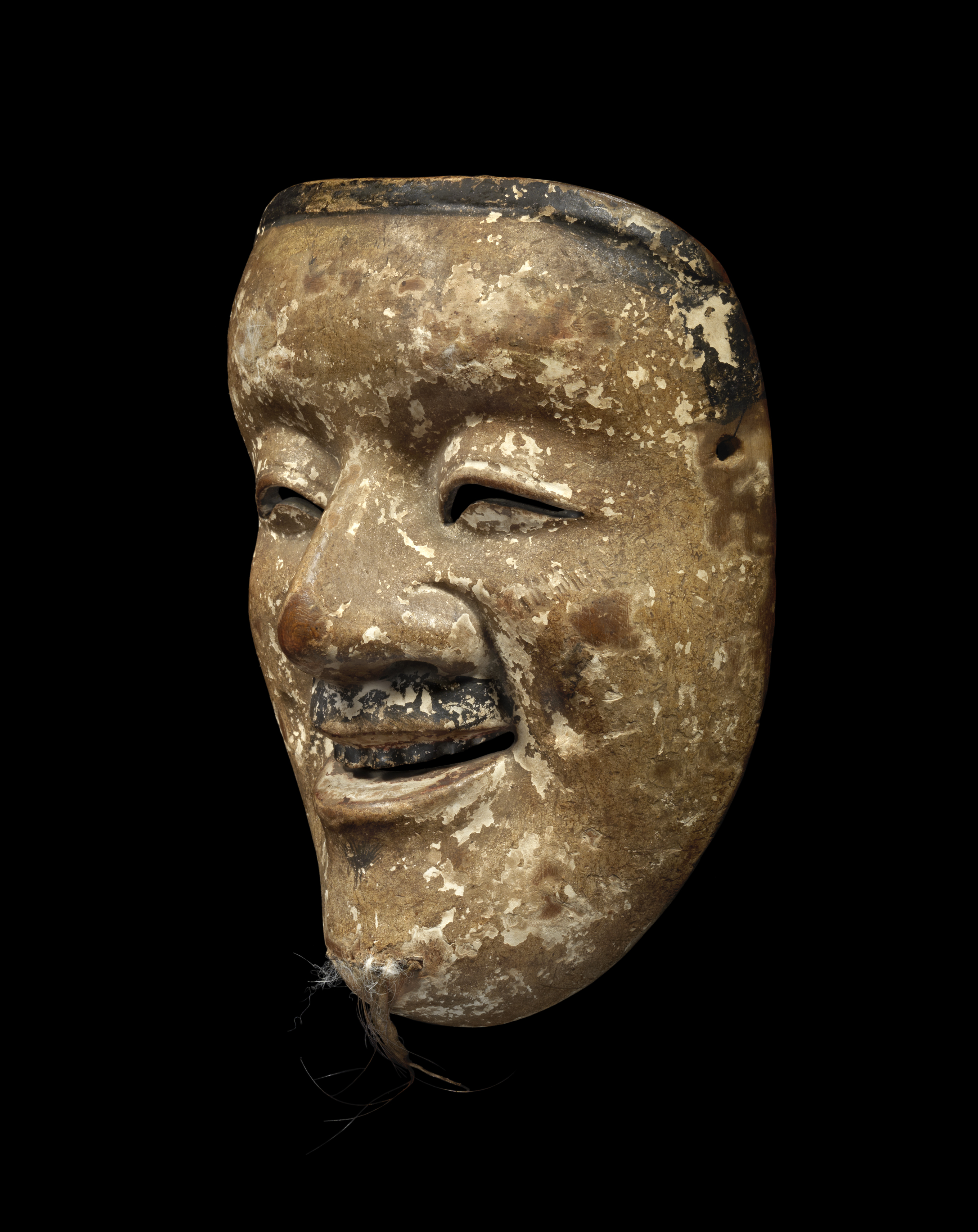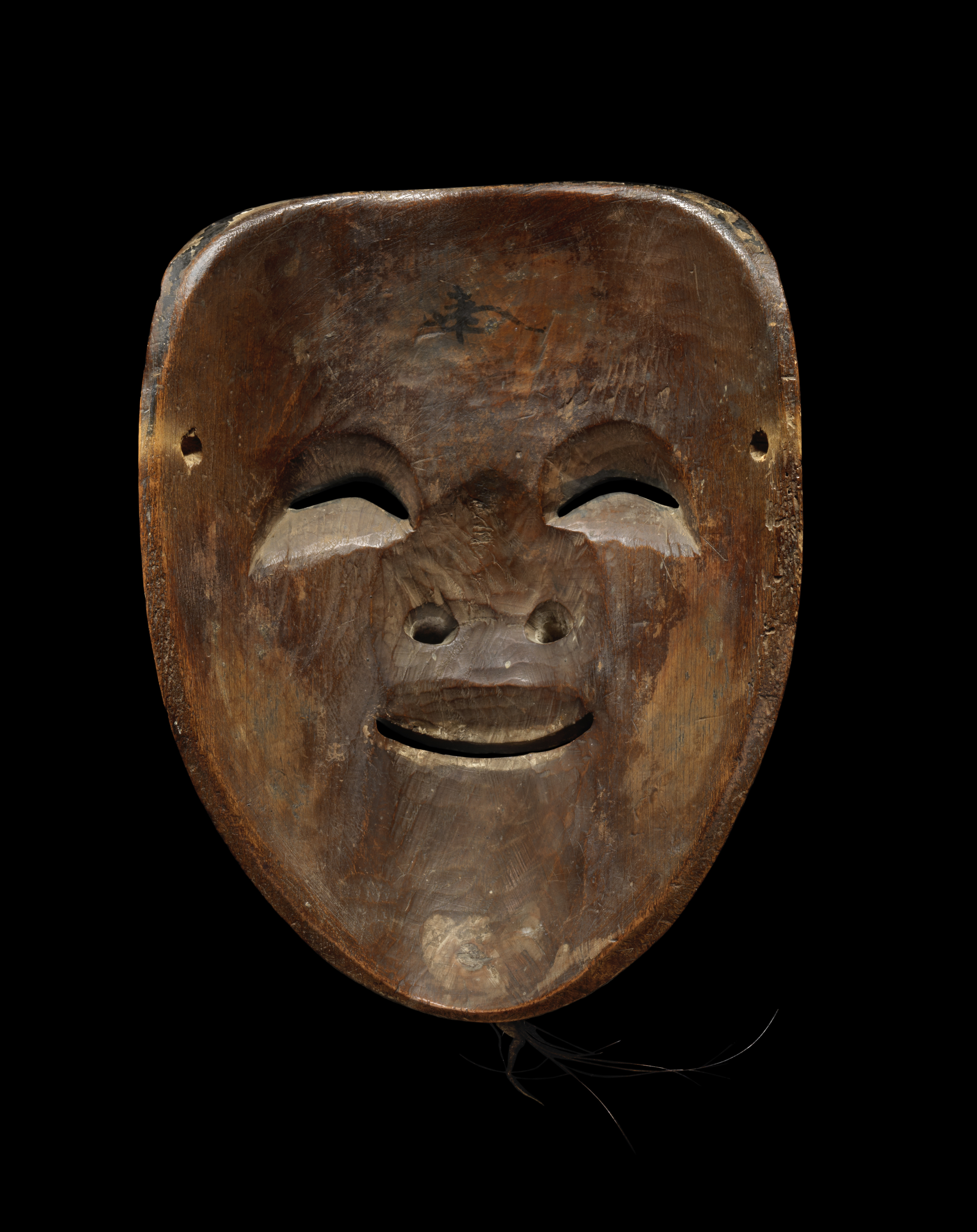 Enmei-Kajya has an almost chubby face and a smiling expression, half closed eyes and full lips arched to show the upper row of teeth. The man is full of energy and his facial outlines as well as the presence of a thin black moustache, reflect this privileged condition. Enmei-Kajya is the "adult man who prolongs life", who is evoked in order to bring longevity. Originally Enmei-Kajya’s mask was part of the Sarugaku repertoire, and it belonged to the group of the Okina "old men". But it already differentiated itself, for it was the only one that did not portray an old woman; also, it had no moving lower jaw like the others. It appeared in the Okina ritual dance in the scene Junitsuki Orai in the company of Chichinojo (the latter having the role of Enmei-Kajya ‘s father), and it was sometimes used in the Noh drama called Sagi. Then it came into the repertoire of popular Kagura masks and of Kyōgen masks. The oldest masks of Enmei-Kajya known date from the Kamakura period (Chusonji temple in Iwate prefecture and Nagataki Hakusan Jinja shrine in Gifu prefecture), which is well before the Noh theater appeared. For this reason, stylistically they still reflect Heian aesthetics, and certain affinities with some Bugaku masks. Probably it was Enmei-Kajya's mask that was used as a prototype for some types of Noh masks.