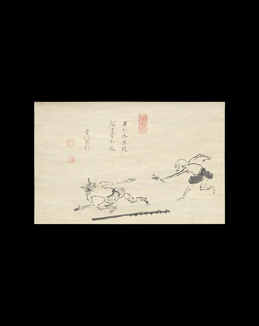 Shunsō was a leader monk of Myōshin-ji temple (Rinzai Sect) in Kyoto. He left many calligraphies and zen-ga. He left many zen-ga, and this motif’s paintings also. Probably he prayed the peaceful happiness for everybody.