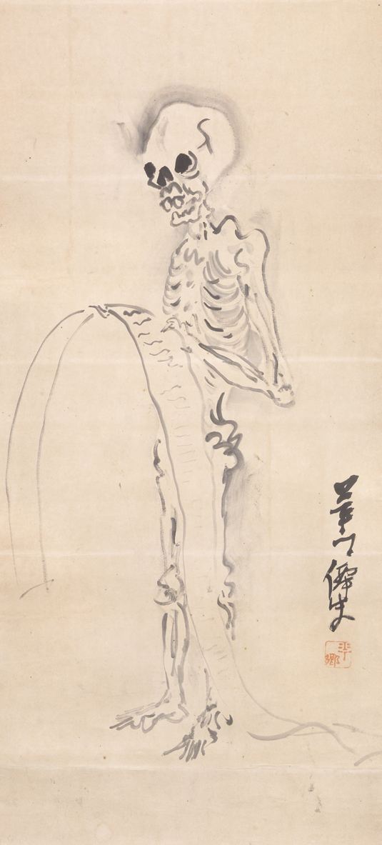 A skeleton is absorbed in reading a long scroll under the hazy moon. It is difficult to say if it is male or a female because its pelvis is hidden behind a scroll. If it is a female, she is perhaps reading a long love letter from her beloved. The skeleton is standing erect and appears immersed in its activity. The painting might be a mitate (allegory) painting of a courtesan reading a love letter. Ukiyo-e masters of the Edo period such as Kitagawa Utamaro (1753-1806) often portrayed the courtesan at the Tea House reading letters under the dim light in the wee hours. It might be a cautionary tale suggesting that Ukiyo (the Floating World) is fleeting and that beauty is only skin deep. Mundane activities and pleasure do not last forever. They are therefore all the more precious!