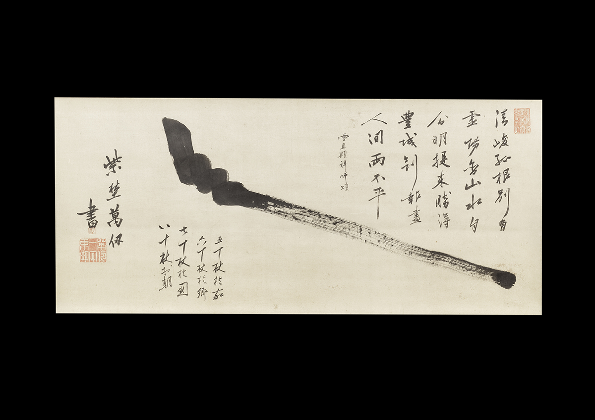 Banjin-Sōtai (18th century) vigorously painted a full-sized stick on a big paper with one stroke without hesitation.