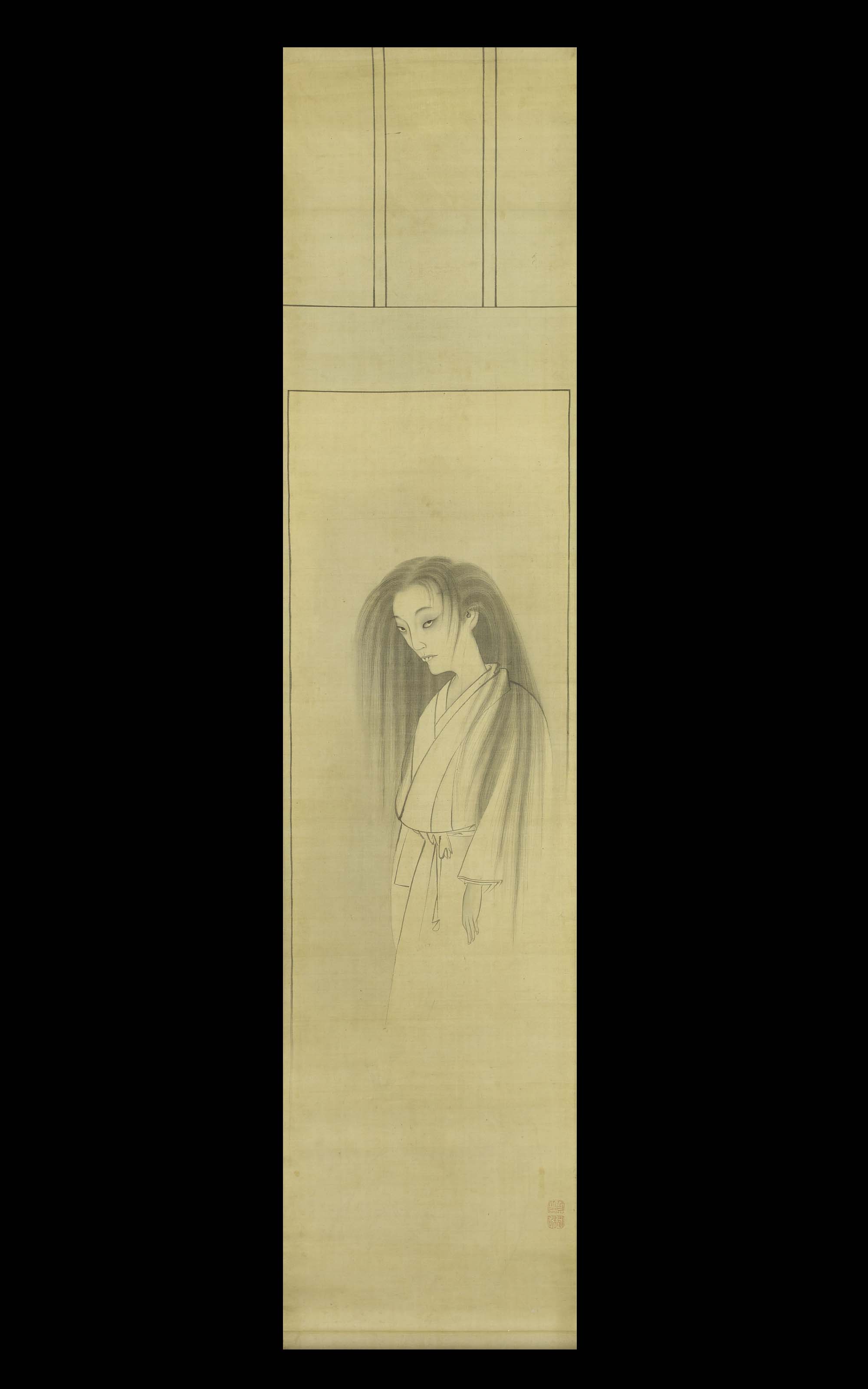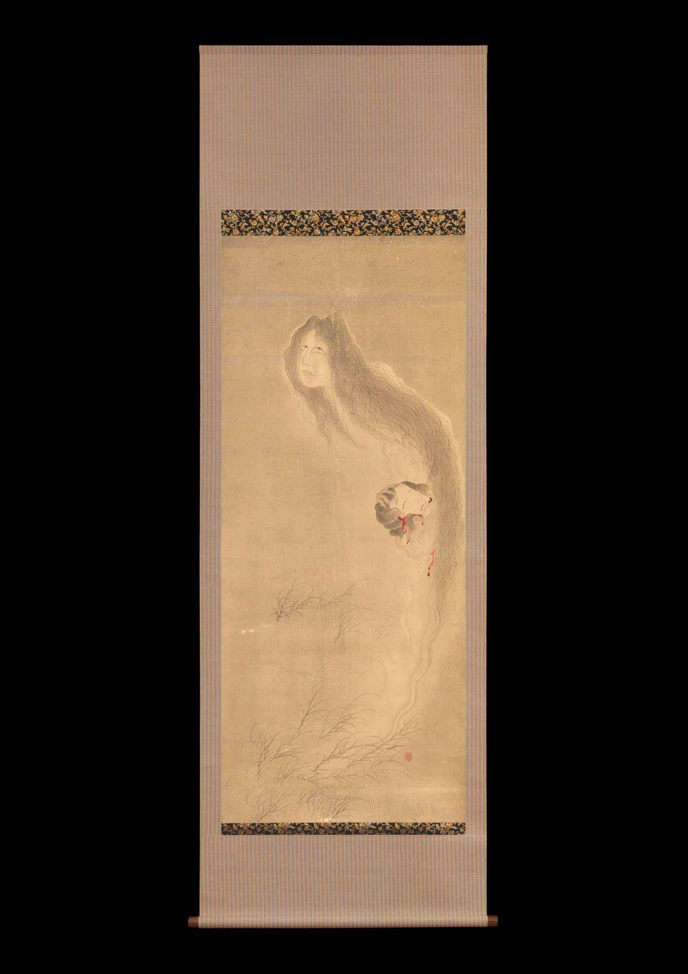 Nagasawa Rosetsu (長沢芦雪, 1754-1799) was an 18th-century (Edo period) Japanese painter of the Maruyama School, known for his versatile style. He was born to the family of a low-ranking samurai. He studied with Maruyama Ōkyo in Kyoto, founder of the Shijō school, who created the first known example of the now traditional yūrei, in his painting The Ghost of Oyuki.