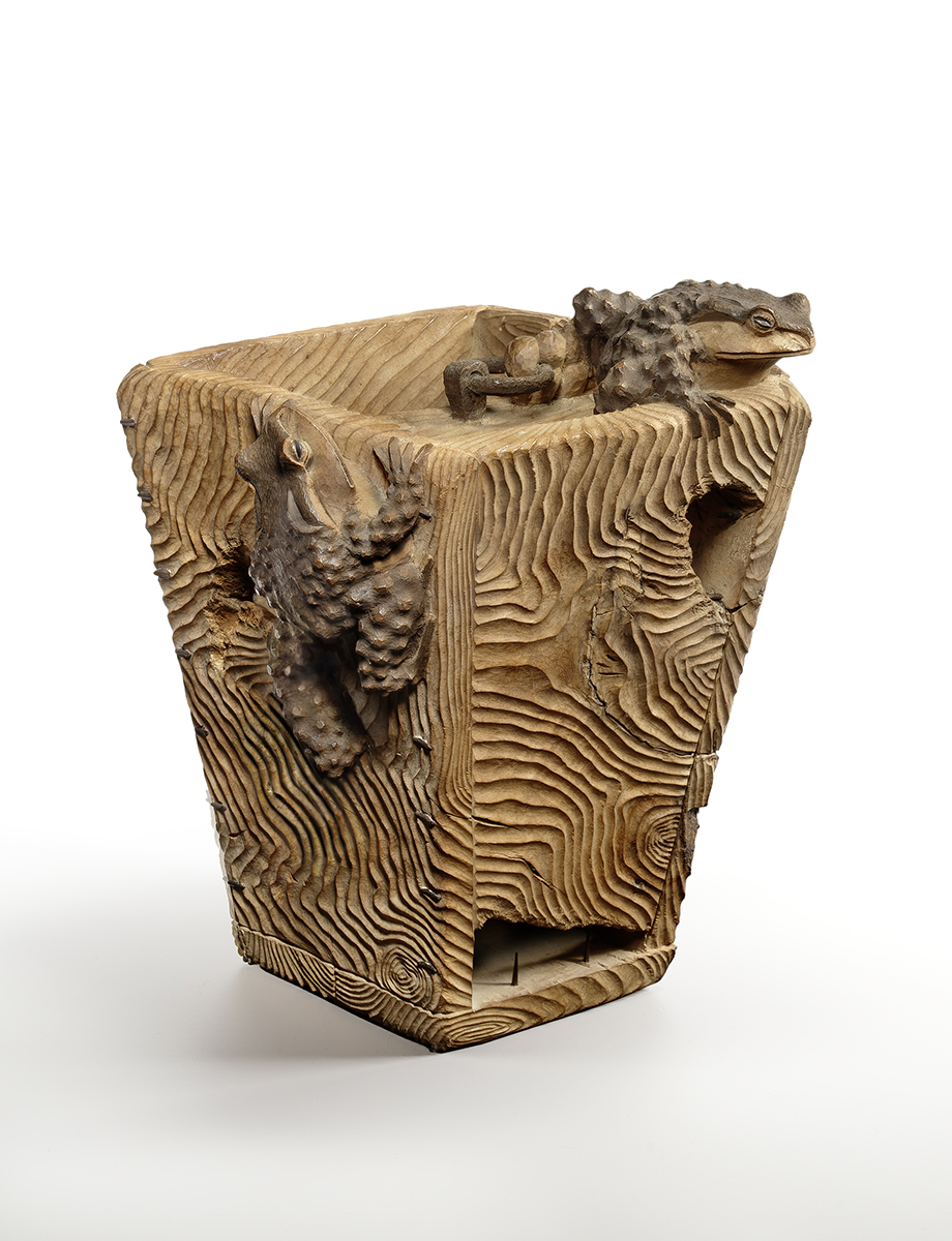 Wooden okimono of a well-bucket with two toads by Sakuratani Naohiro (born in 1919)