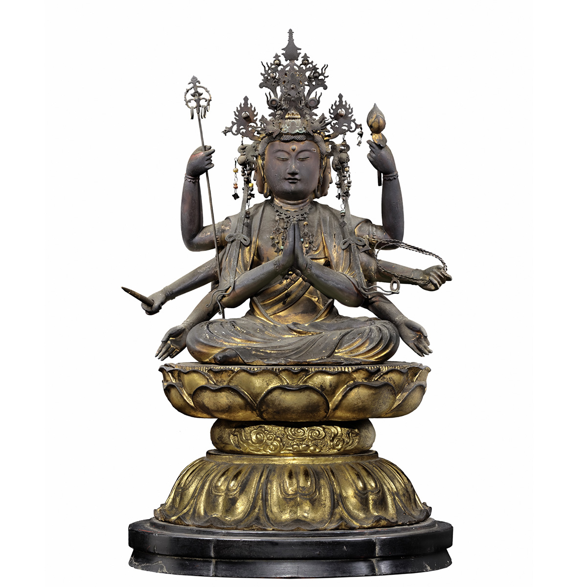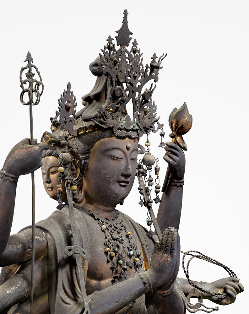 It is depicted with diverse images according to the saccred books of Buddhism, but mostly it has 8 arms with belongings as lotus flower, kenjyaku or monk staff.