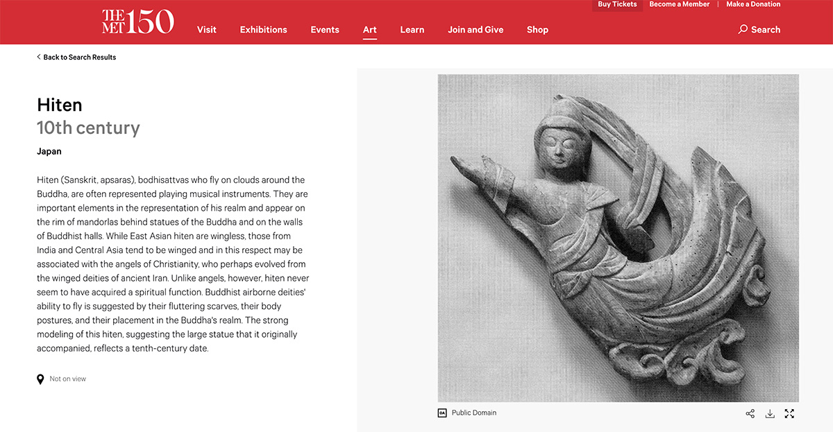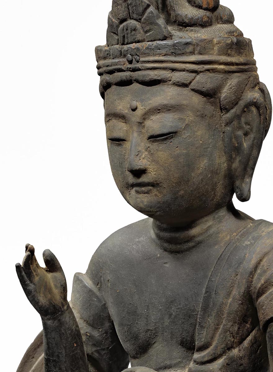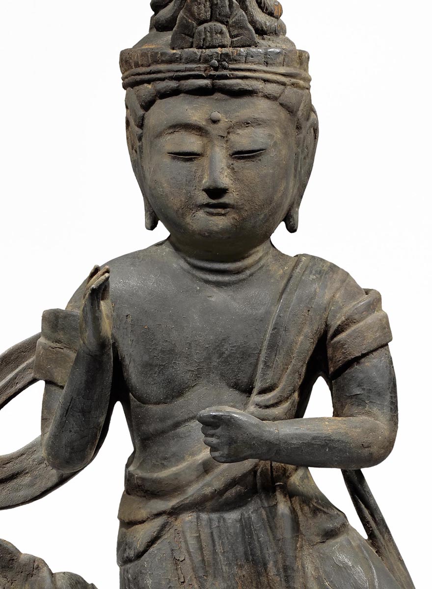 Hiten, literally “Flying Apsaras”, are heavenly beings invisible to the human eye, believed to fly with superhuman power and speed. Japanese Buddhist depictions show Apsaras flying over Buddha's pure land, praising him by scattering flowers, playing instruments or burning incense. Celestial beings such as this were usually placed on the rims of a halo or mandorla behind a Buddha image. The swirling pattern of the cloud indicates that the work was placed on the right side of the mandorla. Considering the work’s size, it may have been part of the mandorla that framed a Buddha about five meters in height. Both hands are probably later additions. Because of the relative proportions of the head and the body, as well as the shape of the clouds, the sculpture appears to have been made in the late Heian Period, around the 12th century. The survival of such celestial beings in private hands is extremely rare.