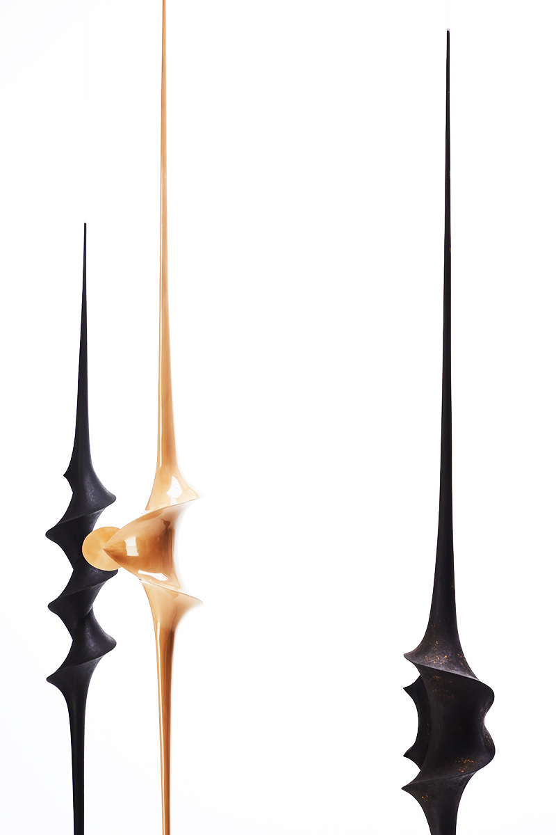 The installation he is presenting at Asia Now brings together a series of slender lacquered wood sculptures that represent mathematical models, in the tradition of the famous photographs taken of such objects by Man Ray.