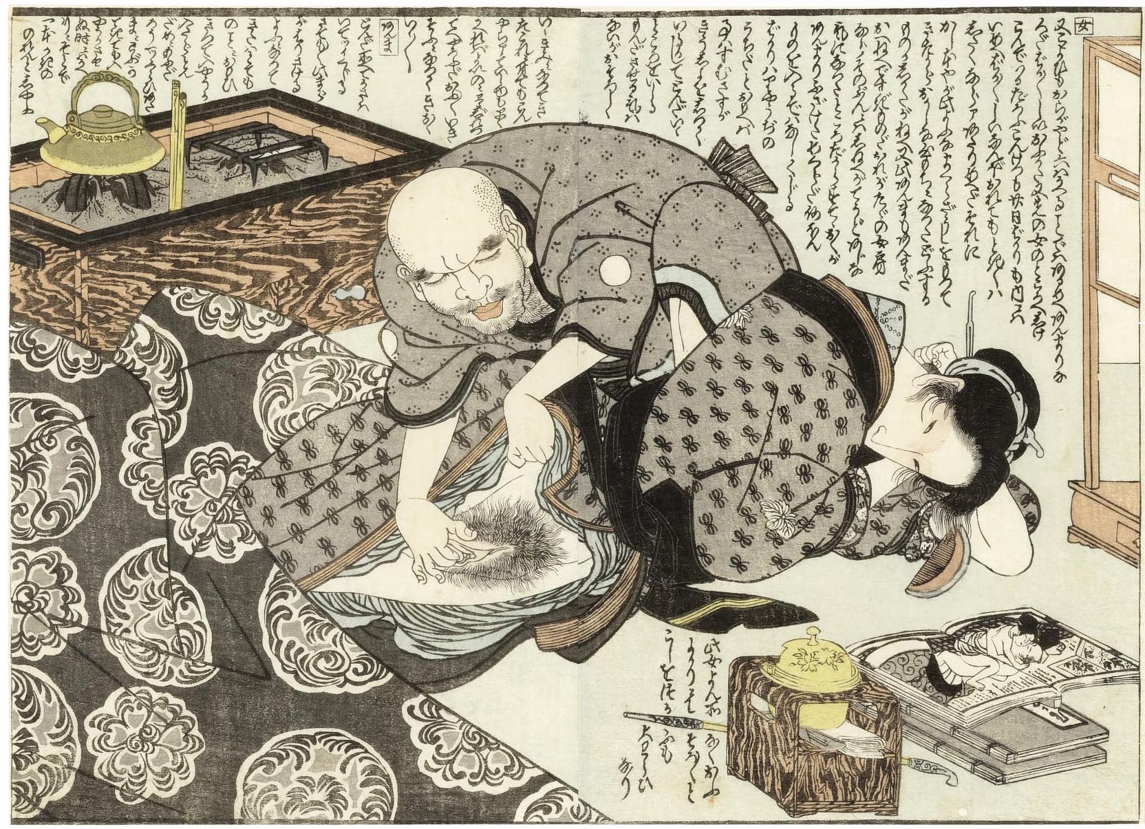 An unshaved bold-headed man carefully approaches a woman. In front of them on the floor a set of shungabooks !